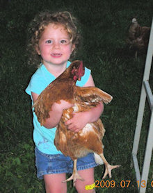 Three and a half year-old Jada Leidy has discovered a different signal to use when she is asking a chicken — Can I pick you up? She says, "I stomp my foot, and the chicken flattens." Jada is the grandniece of Sandy and Russ Thomas of Greenfield, MA, who sent in this photo.